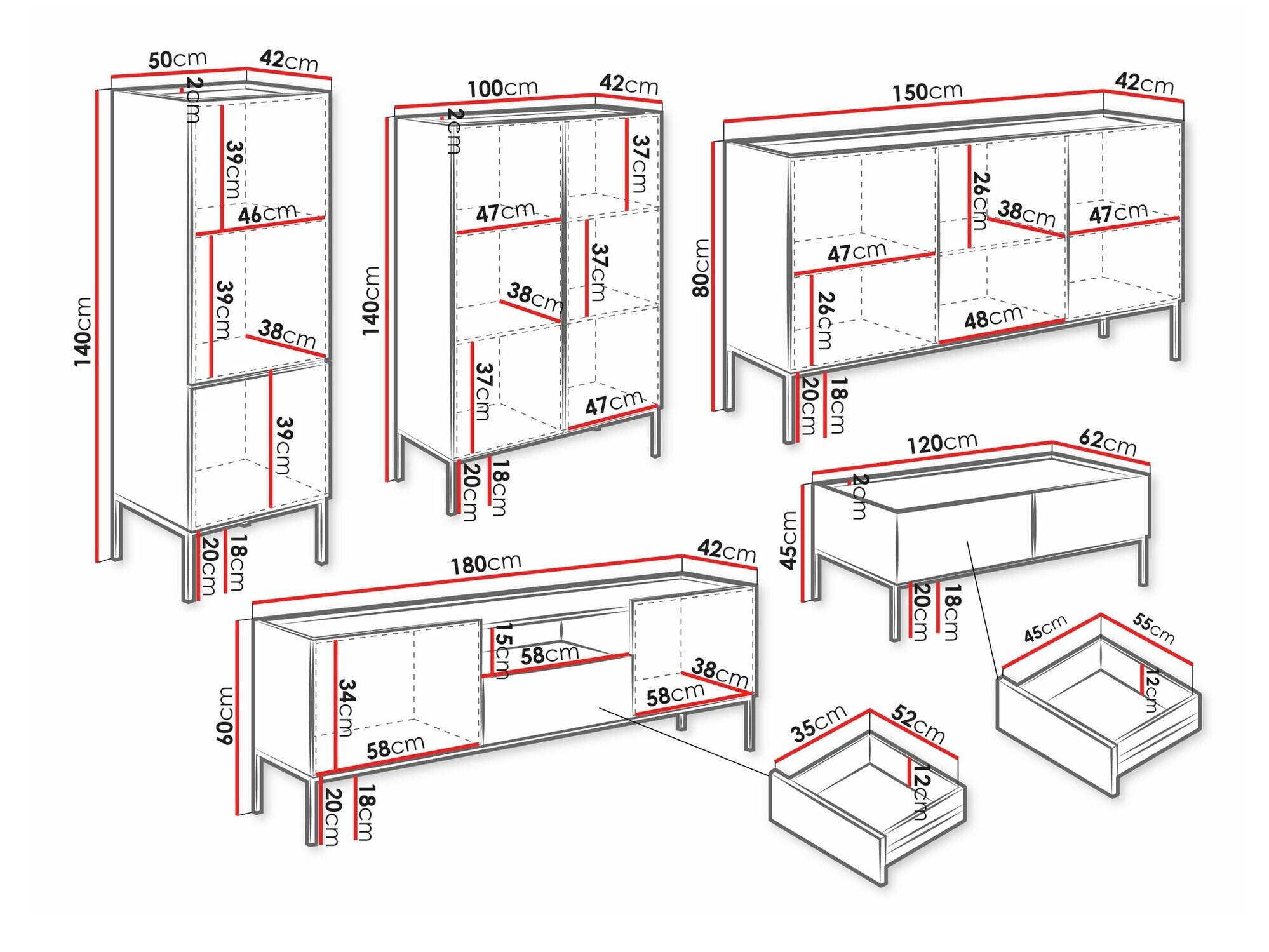 140 x 100 x 42; 140 x 50 x 42 cm