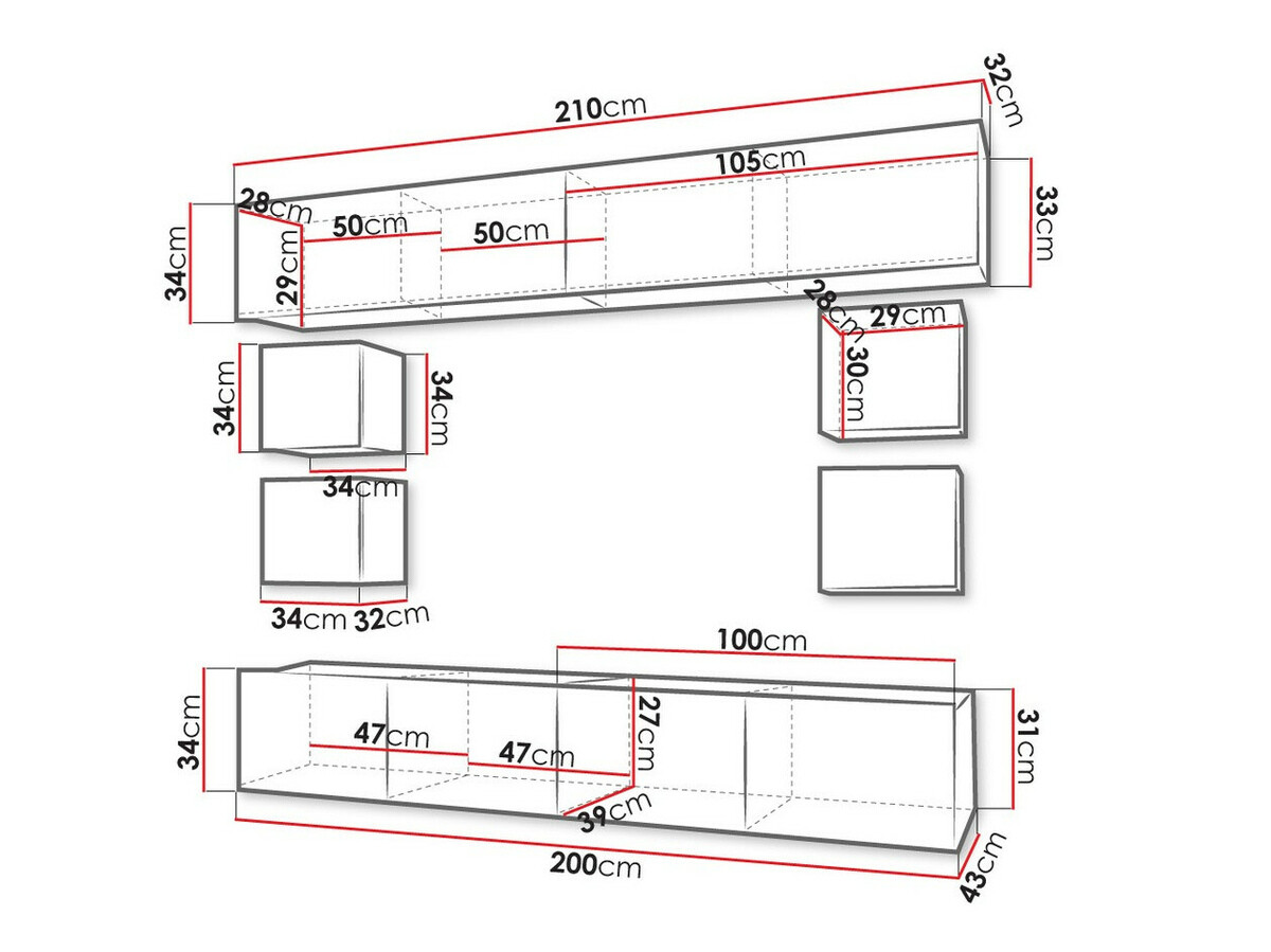 34 x 210 x 32; 34 x 34 x 28 cm