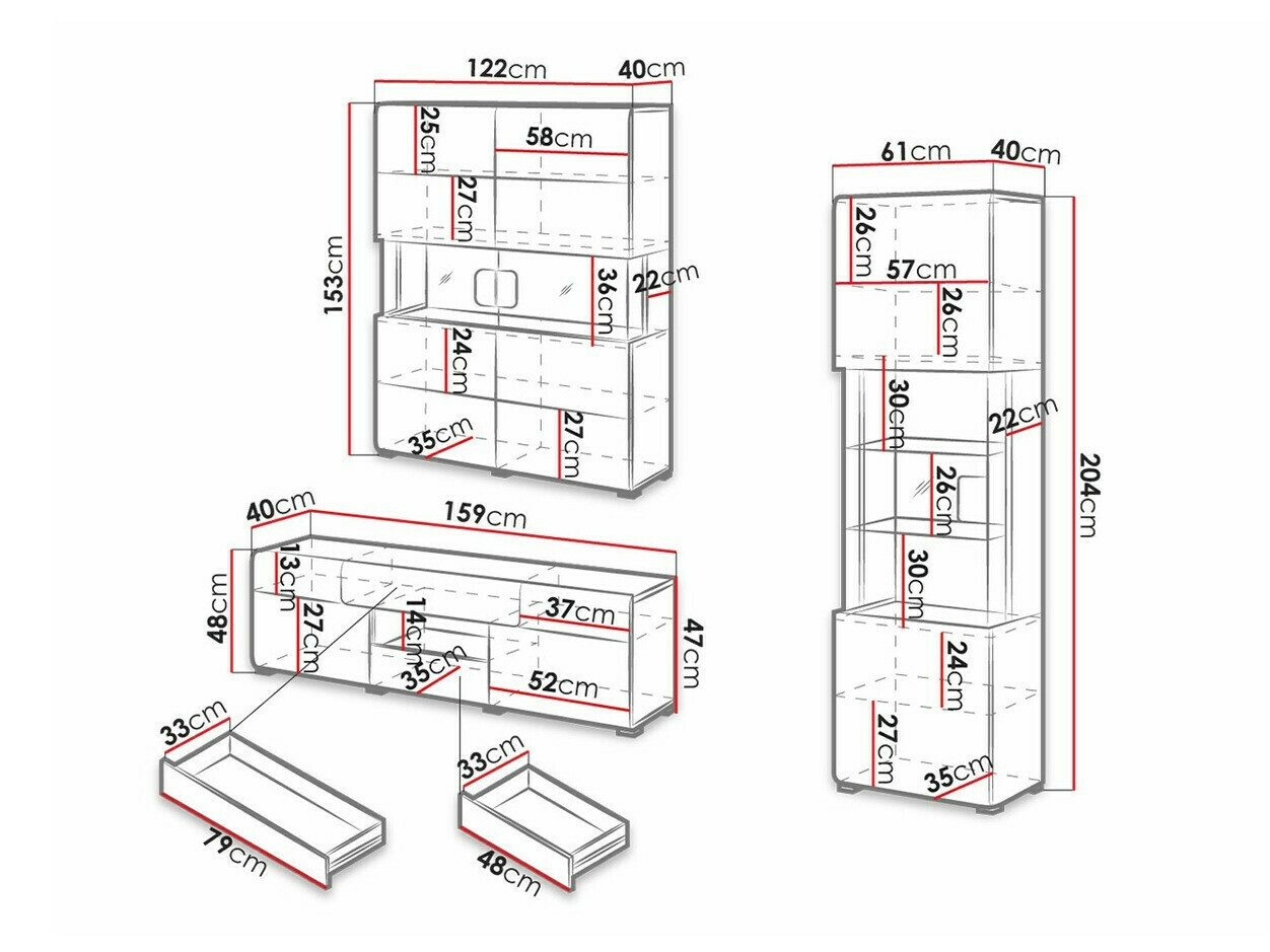 204 x 61 x 40; 153 x 122 x 40 cm