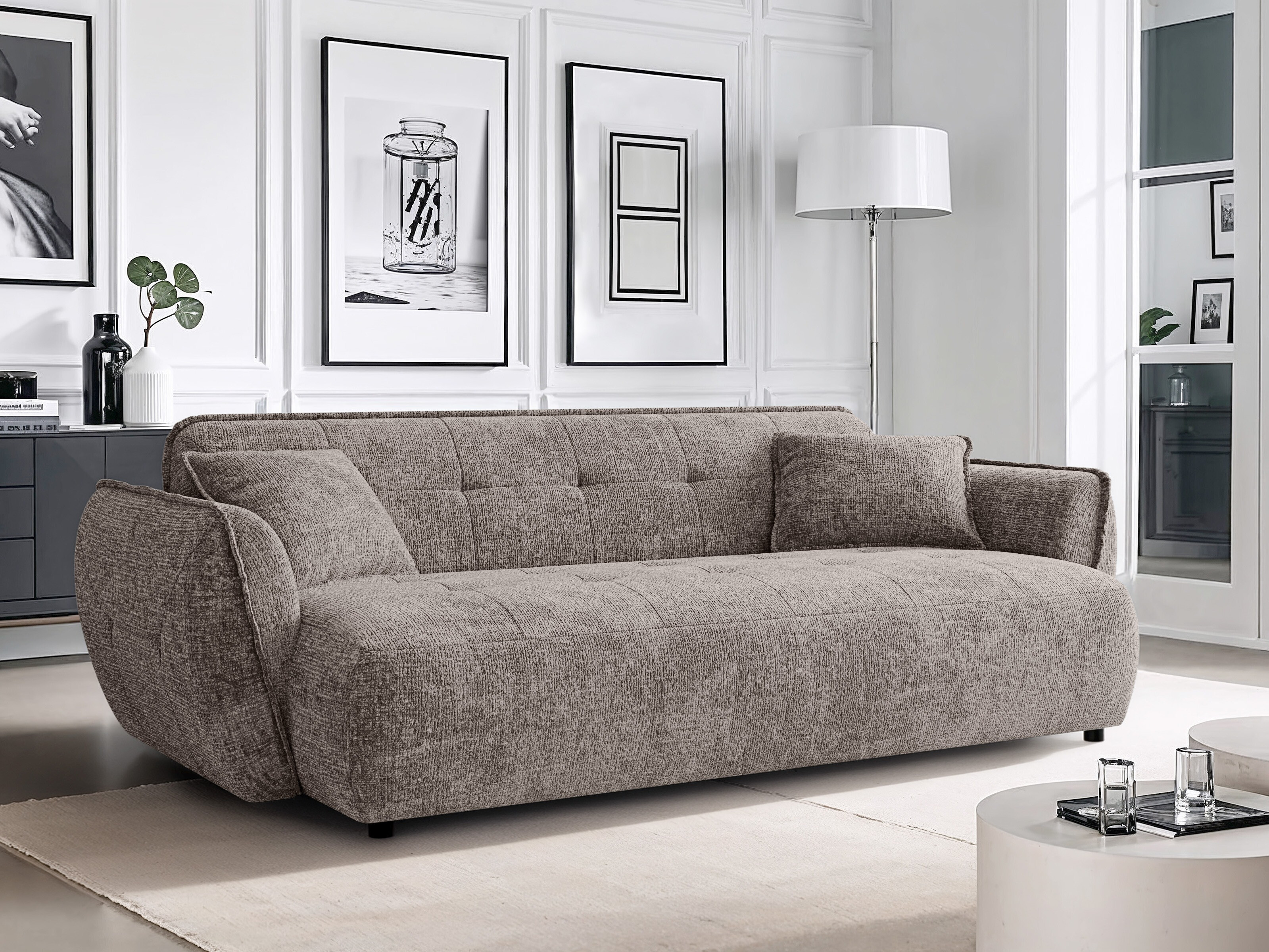 Mehka in nežna tkanina s teksturirano površino in subtilnim bisernim leskom. Površina blaga je žametna in spreminja odtenek glede na osvetlitev. Tkanina ima certifikat »Reach«, ki potrjuje, da ne vsebuje škodljivih snovi. Površino tkanine je priporočljivo vzdrževati samo z nežnimi čistilnimi sredstvi, posebej zasnovanimi za oblazinjeno pohištvo.