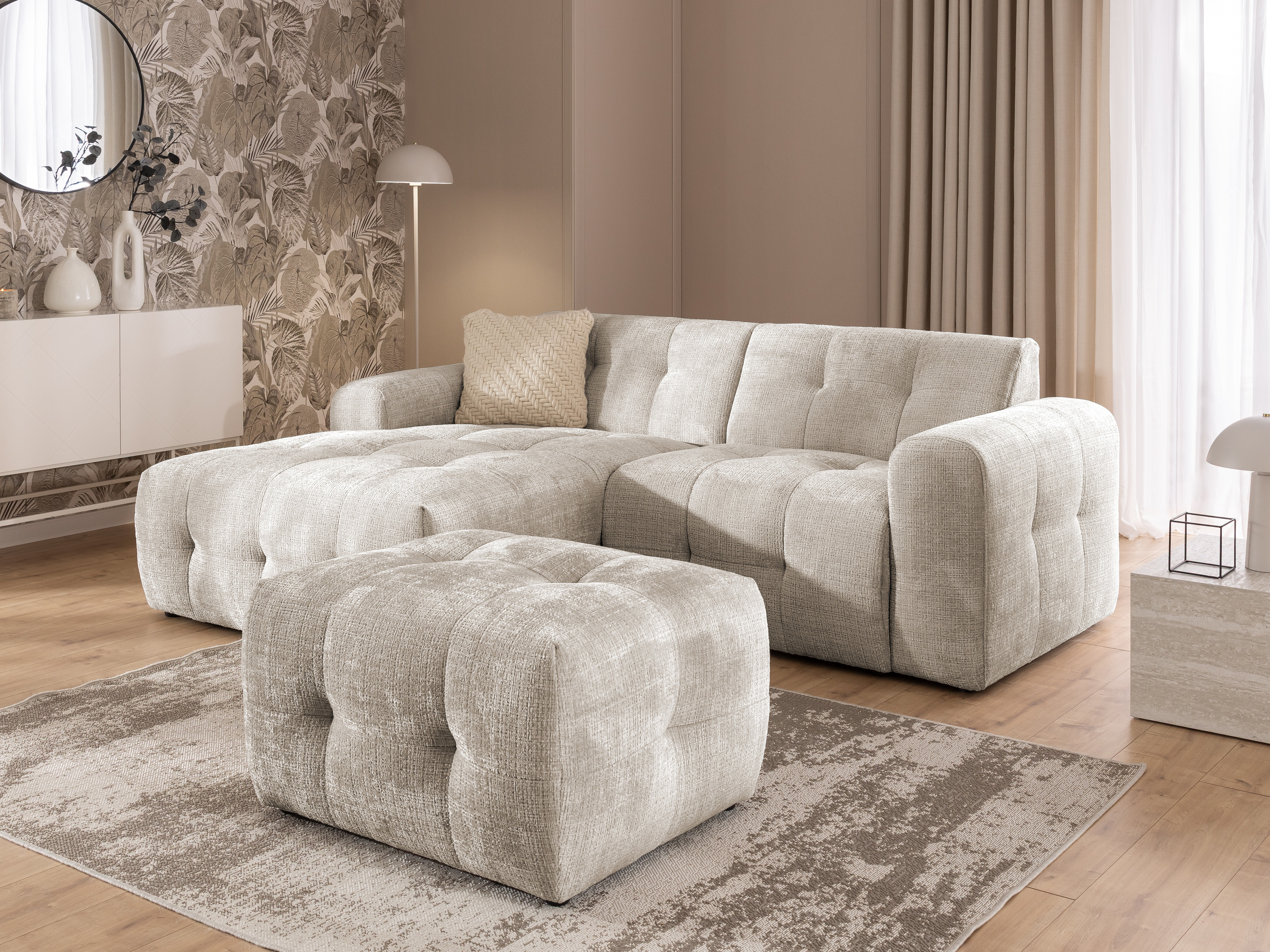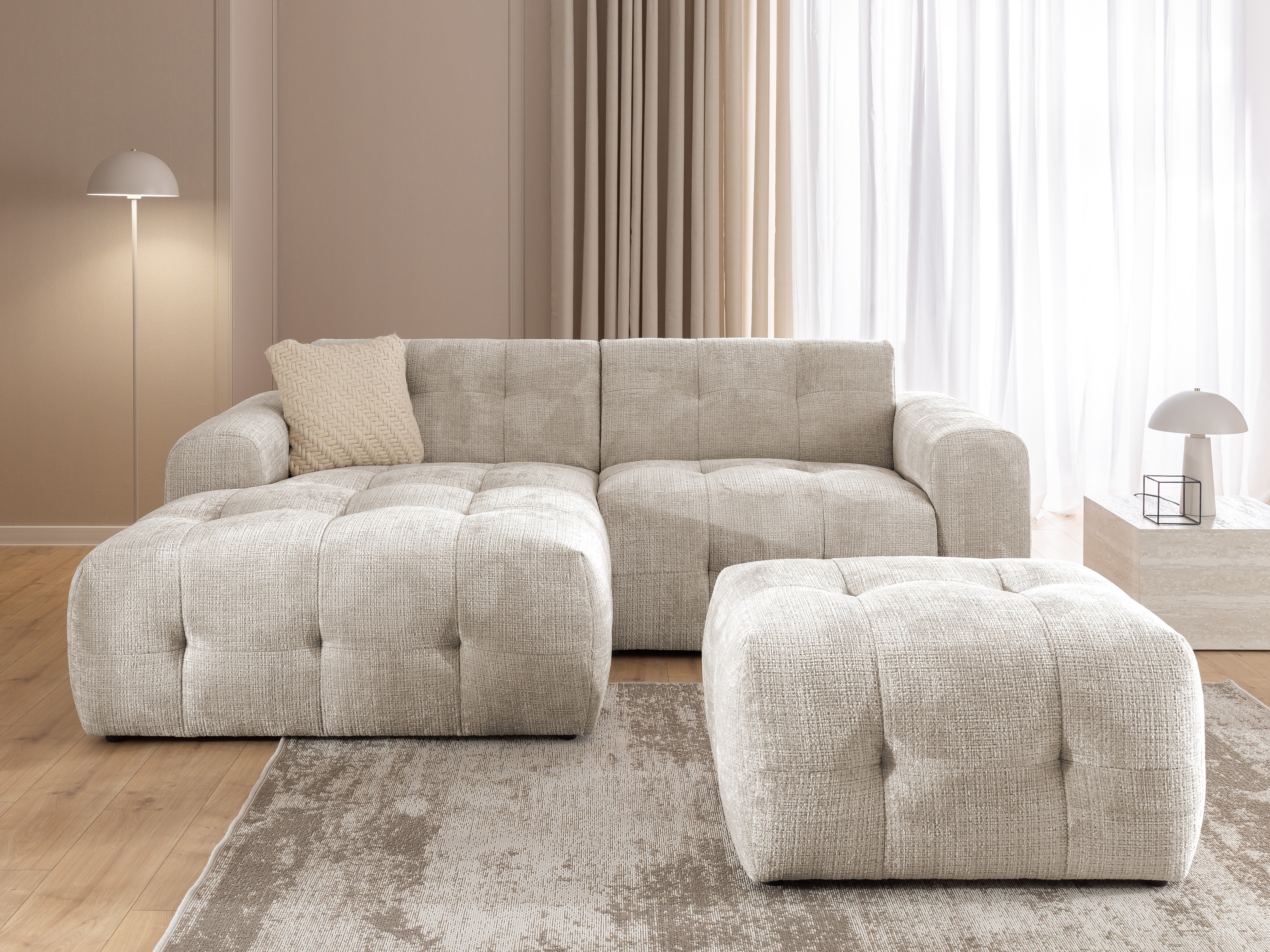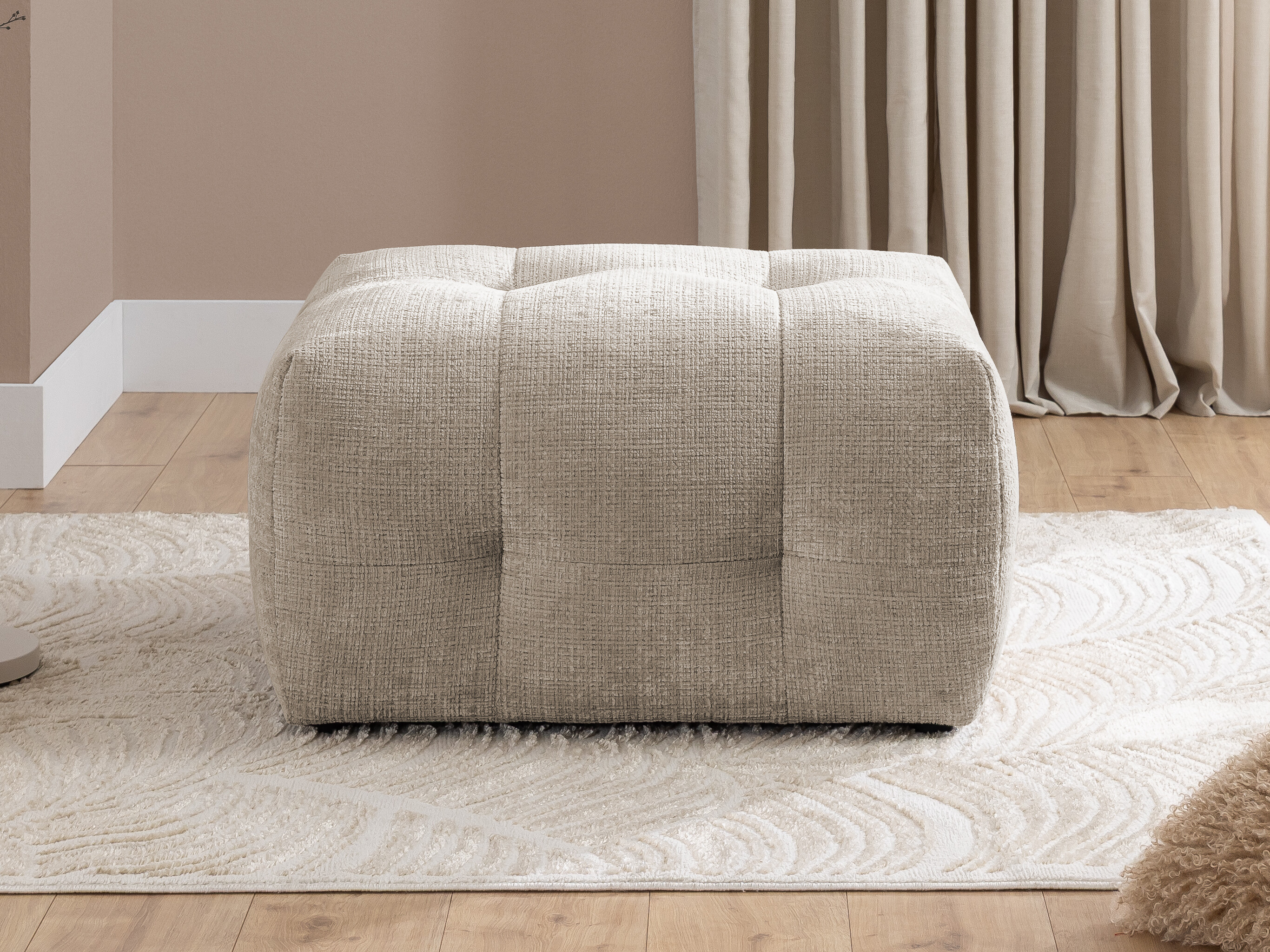Mehka in nežna tkanina s teksturirano površino in subtilnim bisernim leskom. Površina blaga je žametna in spreminja odtenek glede na osvetlitev. Tkanina ima certifikat »Reach«, ki potrjuje, da ne vsebuje škodljivih snovi. Površino tkanine je priporočljivo vzdrževati samo z nežnimi čistilnimi sredstvi, posebej zasnovanimi za oblazinjeno pohištvo.