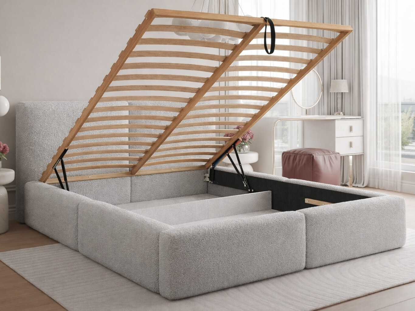 Tkanina iz recikliranega poliestra s teksturo zank in vozlov v različnih velikostih, daje skupaj s subtilnim leskom, pohištvu značilen značaj. Površino tkanine je priporočljivo čistiti samo z nežnimi čistilnimi sredstvi, posebej zasnovanimi za oblazinjeno pohištvo.