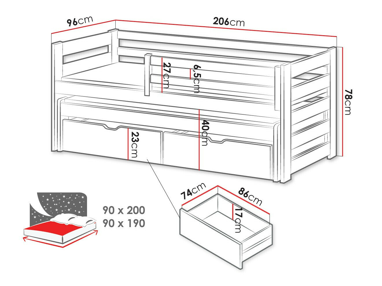 - 90 x 190 cm